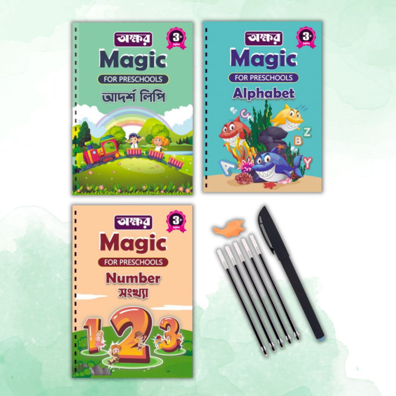 ✔️ প্রতিটি বইয়ে বর্ণমালা ও সংখ্যা খাঁজ কাটা রয়েছে, যাতে বাচ্চারা সহজে লিখতে পারে।